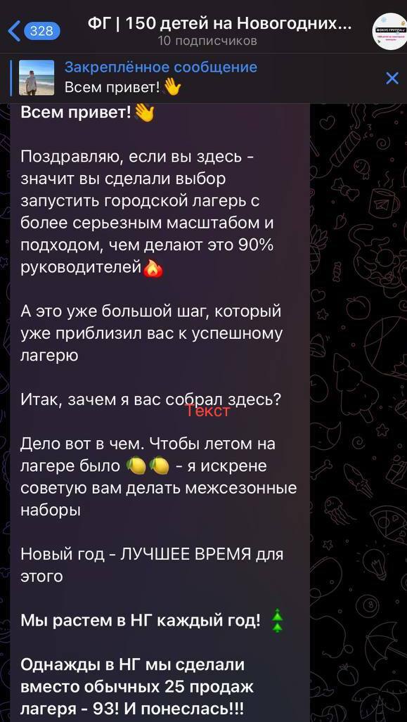 - Закрытый канал (фокус группа) - Обмен опытом с коллегами из разных городов - Еженедельные РАЗБОРЫ участников - База знаний по запуску городского лагеря на 150 детей!